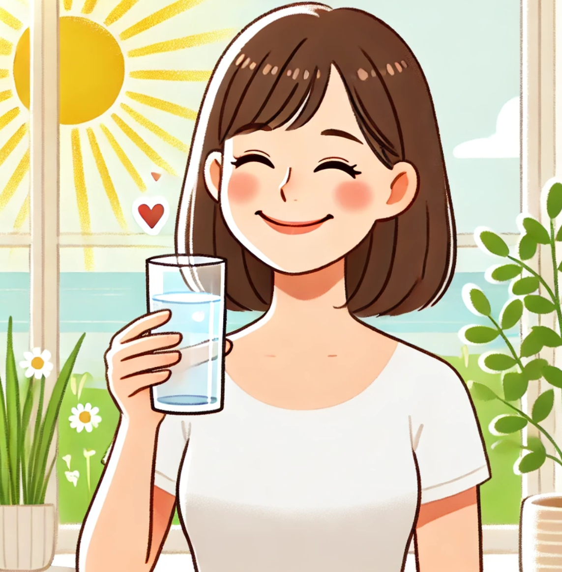 우리 몸은 대부분 물로 이루어져 있어요. 아침에 일어나자마자 물 한 잔을 마시면 하루가 활기차게 시작될 수 있답니다. 하루 동안 조금씩 물을 마시면 몸속의 나쁜 것들을 밖으로 내보내는 데도 도움이 돼요. 또, 물을 많이 마시면 피부도 촉촉해져요. 집이나 학교에서 목이 마르지 않게 조금씩 자주 물을 마셔보세요.