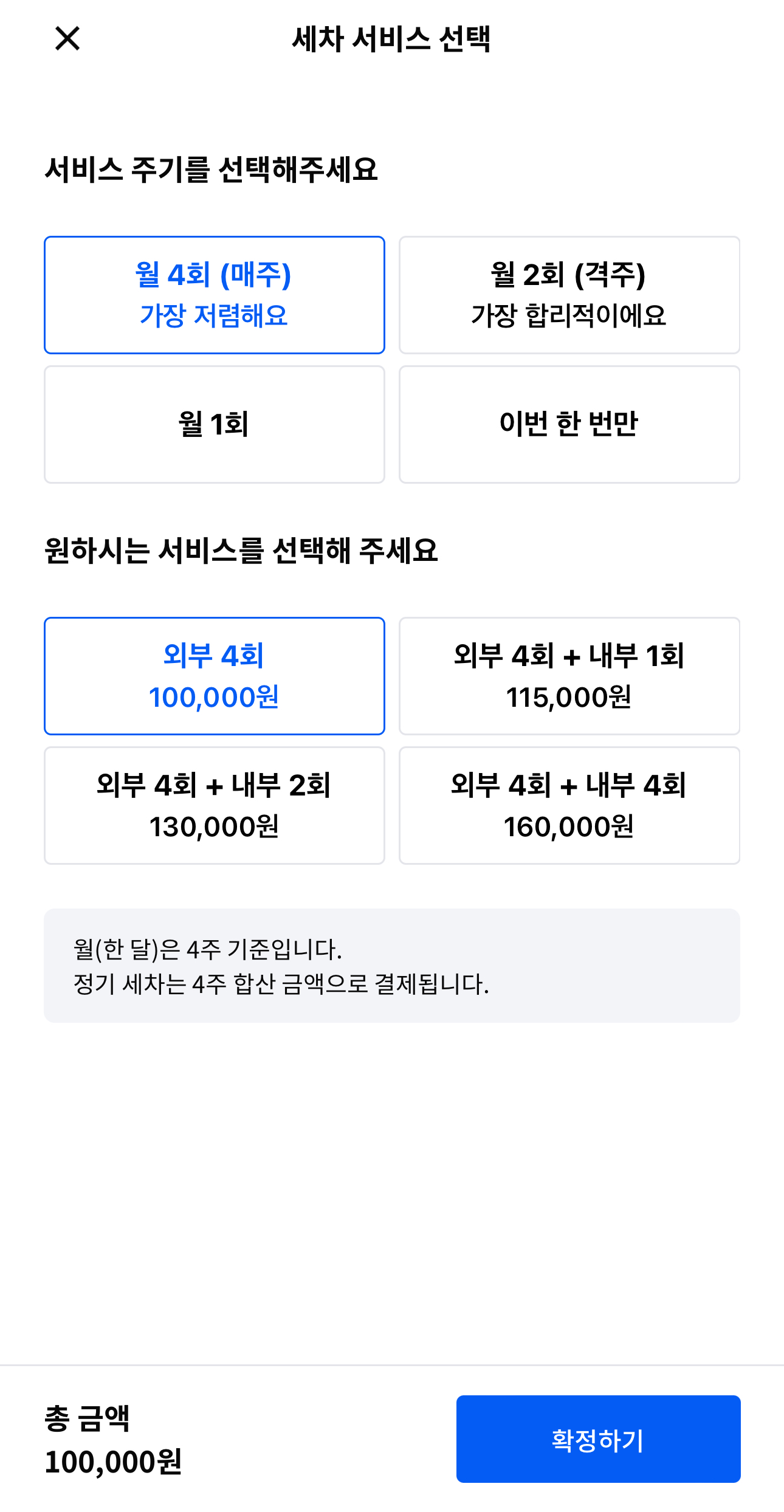 월4회 매주 세차 서비스를 이용했을때가 가~장 저렴했었기에