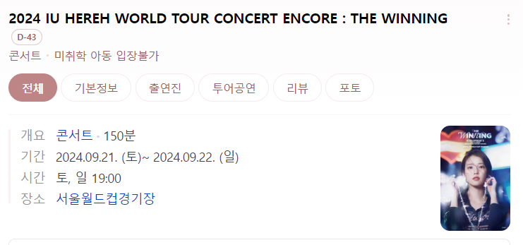 - 공연명: 2024 IU HEREH WORLD TOUR CONCERT ENCORE THE WINNING