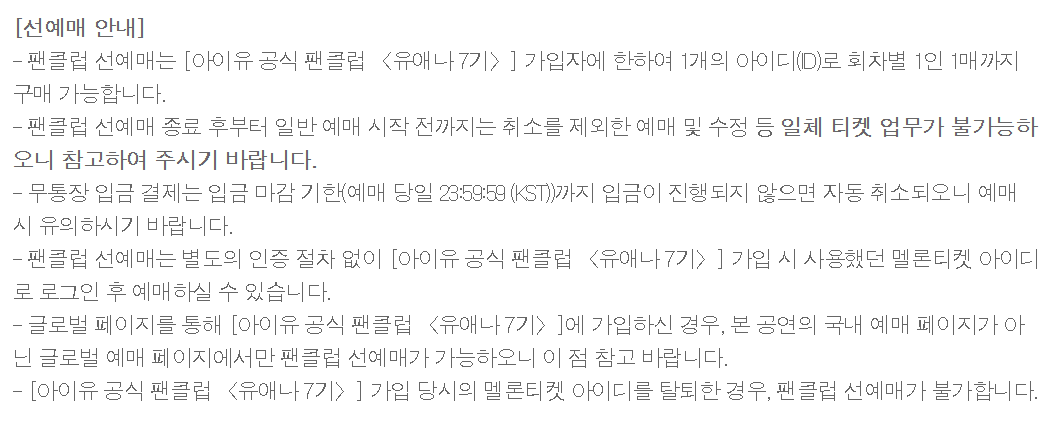 아이유 공식 팬클럽 유애나 7기 가입자만 팬클럽 선예매에 참여할 수 있어요. 별도의 인증 절차 없이 유애나 7기 가입 시 사용했던 멜론티켓 아이디로 로그인 후 예매할 수 있답니다. 회차별로 1인 1매만 구매 가능하고, 선예매 티켓 오픈일은 2024년 8월 12일(월) 오후 8시예요.