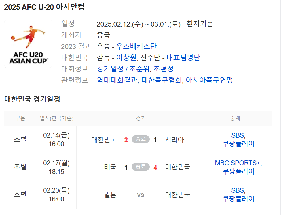 2025 AFC U-20 아시안컵 한국 대표팀 경기 일정