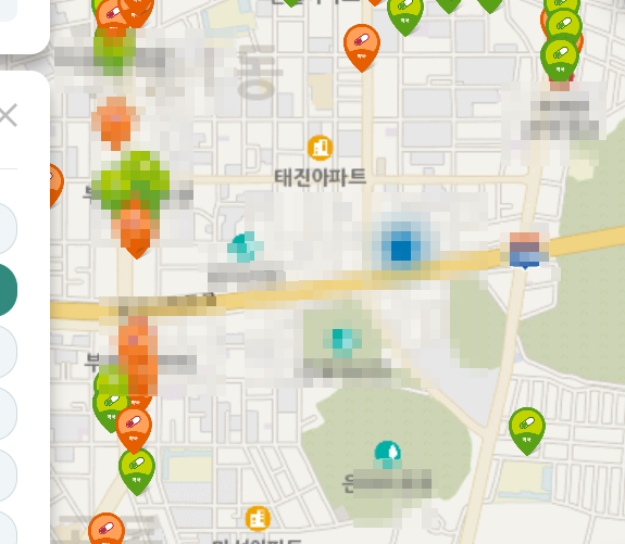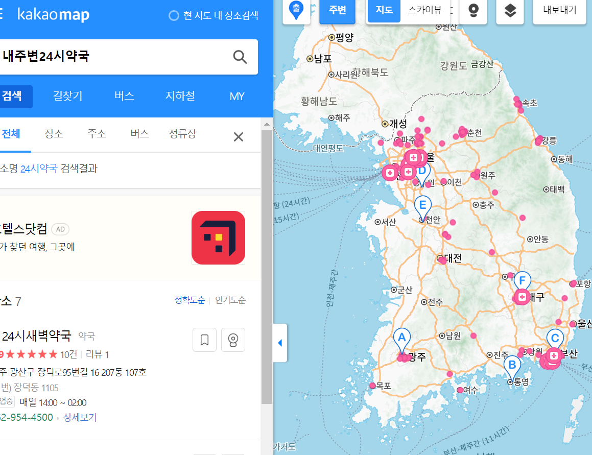 초록색은 주말까지, 붉은색은 평일에만 운영을 하는 곳이기 때문에 근처의 약국을 찾으면 된다.