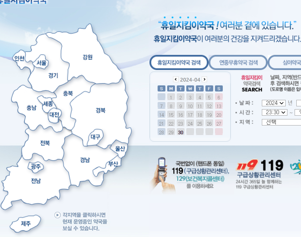 대한약사회가 운영하는 이 서비스는 휴일, 주말 및 심야에 운영하는 약국 목록을 제공합니다.