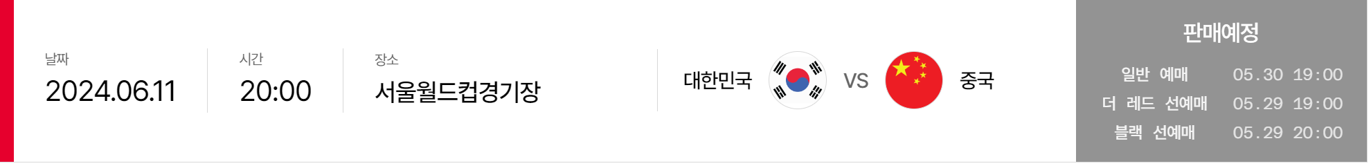 - 중국전: 2024년 6월 11일 (화) 20:00, 서울월드컵경기장