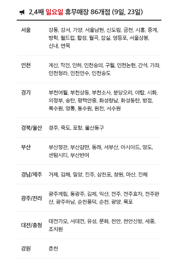 | 6월 10일, 24일 | 만촌점, 반야월점, 성서점, 월배점, 칠성점 |