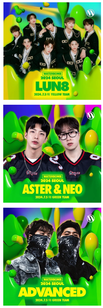 워터밤은 두 팀으로 나뉘어 워터 파이팅 대결을 펼치는 독특한 구조로 진행됩니다. 올해 서울 공연에서는 그린팀과 옐로우팀으로 나뉘어 대결합니다.